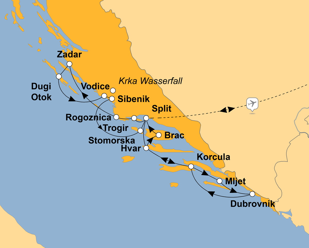 Trogir - Rogoznica - Zadar - Insel Dugi Otok - Passage Kornaten - Vodice - Šibenik - Zlarin - Skradin - Insel Šolta - Split - Hvar - Korčula - Mljet - Elafiten-Inseln - Korčula - Elafiten-Inseln - Hvar - Brač - Čiovo - Trogir
