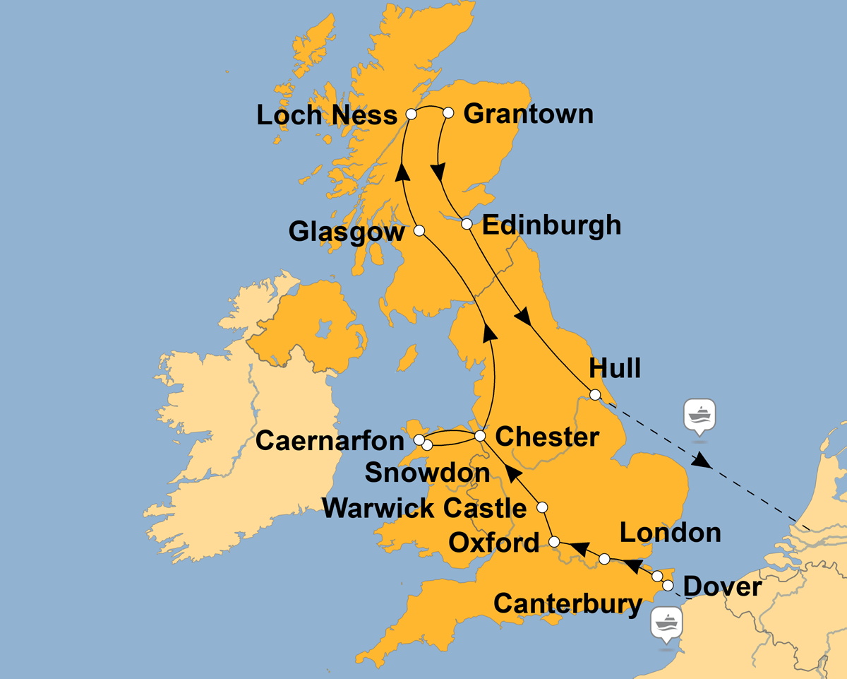 Nach dem Frühstück heißt es Leinen los. Die komfortablen Fährschiffe bringen Sie in kurzer Zeit über den Ärmelkanal. Schon von Weitem begrüßen Sie die weißen Kreidefelsen von Dover. Das „Abenteuer Insel“ beginnt!