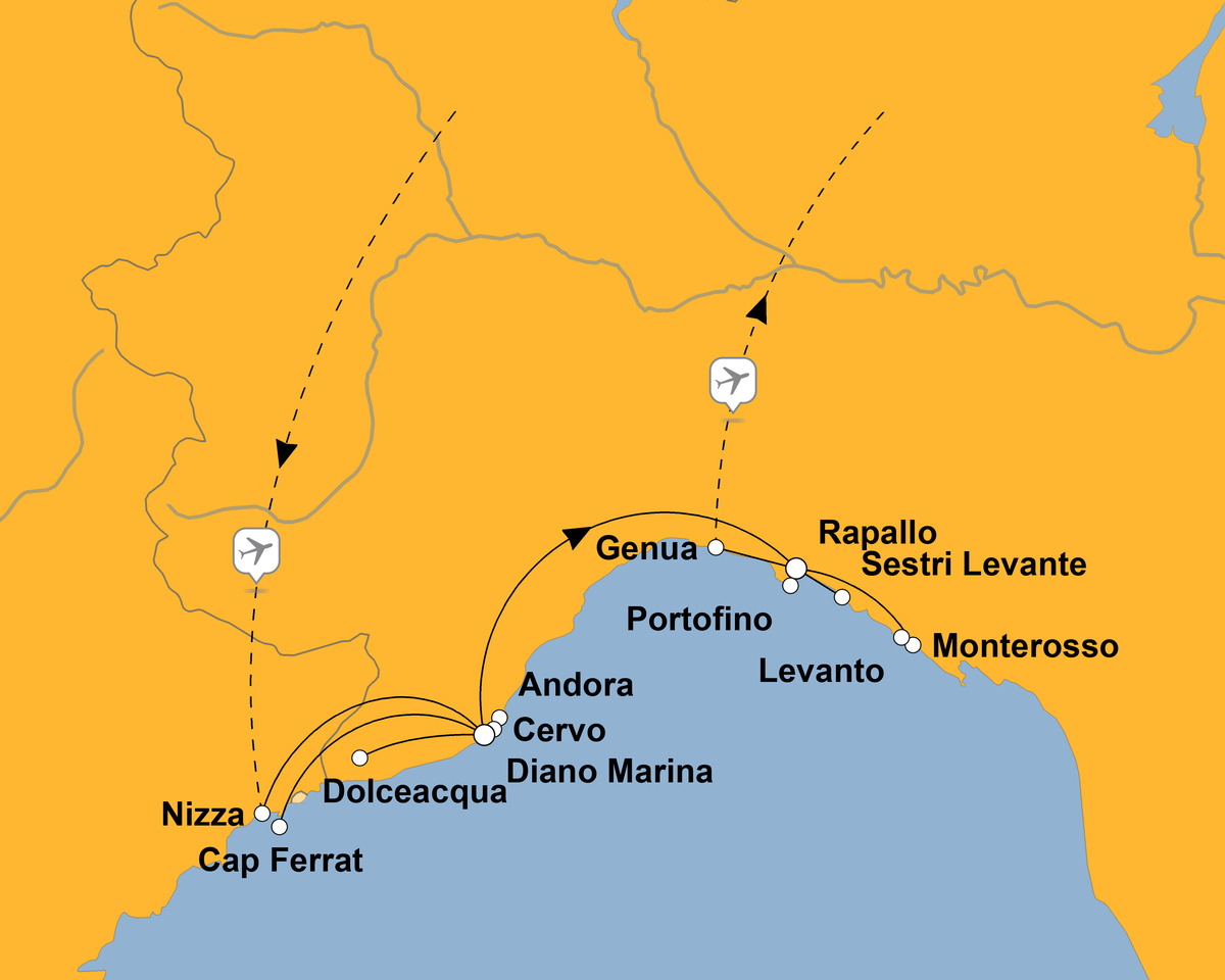 - Rundgänge: Dolceacqua, Camogli, San Fruttuoso, Portofino, Rapallo, Monterosso, Levanto